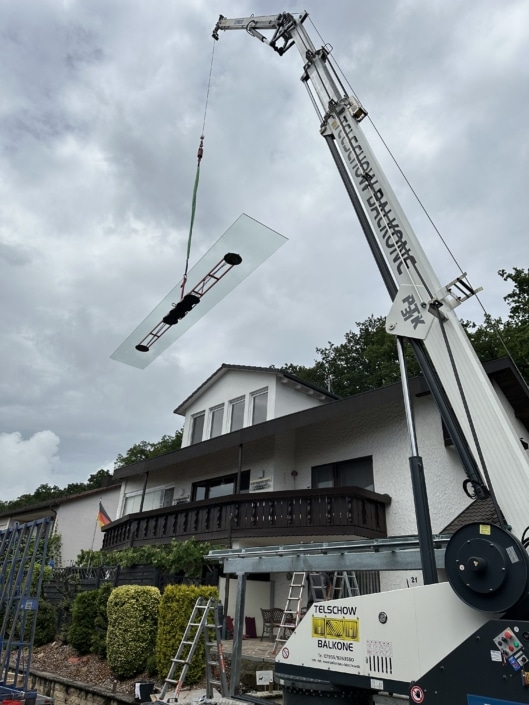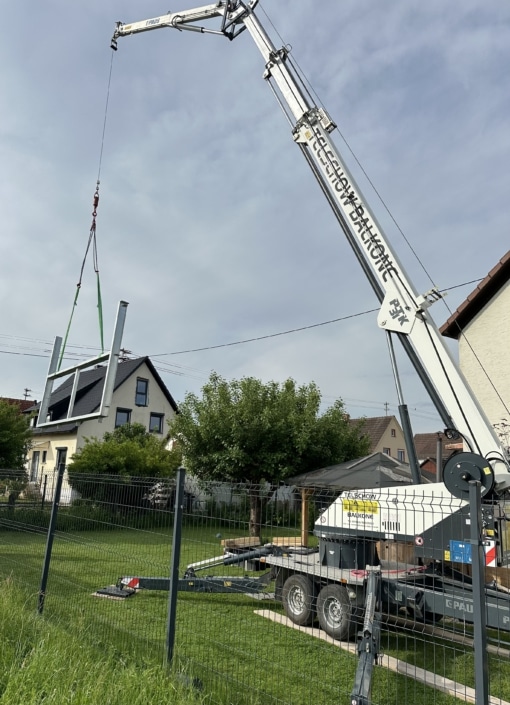 Mit einer Kranhöhe von etwa 31 Metern bietet dieser Anhängerkran beachtliche Reichweite und Flexibilität für verschiedene Aufgabenstellungen. Zudem ist er mit einem Glassauger und weiteren Anbauteilen ausgestattet, was den Einsatzbereich des Krans erweitert.